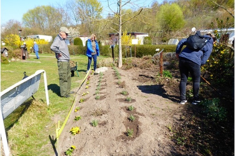 Nach dem Winter war es auch an der Zeit, einige Schlaglöcher im Parkplatzbereich auszubessern. Außerdem wurde das größte Kräuterbeet des Vereins neu gestaltet und ein Teil zunächst mit Frühlingsblumen und Lavendel bepflanzt, ehe später noch kälteempfindliche Kräuter nachgepflanzt werden.