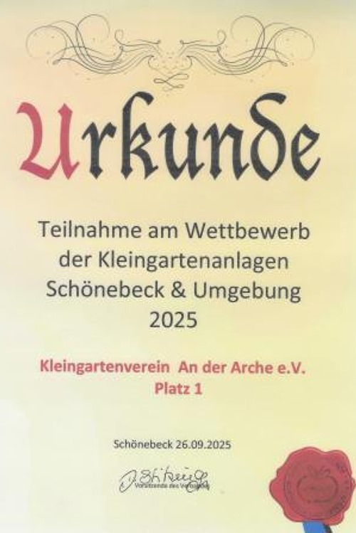 Wir haben nicht nur am Wettbewerb der Kleingartenanlagen unseres Verbandes teilgenommen, nein, wir haben den "1. Platz" errungen.