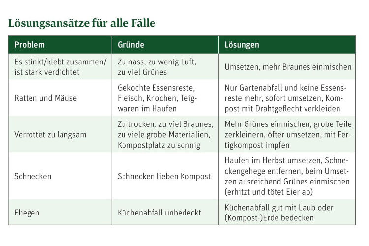 Es stinkt oder klebt zusammen? Es verrottet zu langsam? Sie haben Problem mit Raten, Mäusen Schnekcen oder Fliegen? Dafür kann es mehrere Gründe geben. In der linken Tabelle haben wir diese mit Lösungsansätzen zusammengefasst.