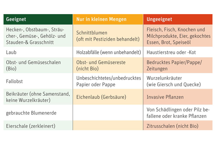 Was gehört auf den Kompost? Zum Vergrößern der Tabelle bitte darauf klicken.